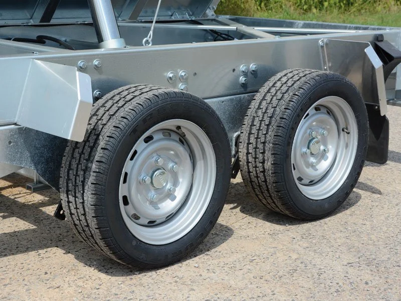 Châssis, essieu(x) et timon en V galvanisés, essieu(x) à suspension en caoutchouc.