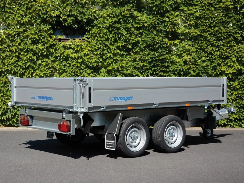 Ridelles en alu anodisé avec rainure pour attacher une bâche (épaisseur : 25 mm, largeur : 330 mm), les ridelles sont ouvrable et amovibles des 4 côtés, ridelle arrière oscillante dans les 2 sens, 4 ranchers