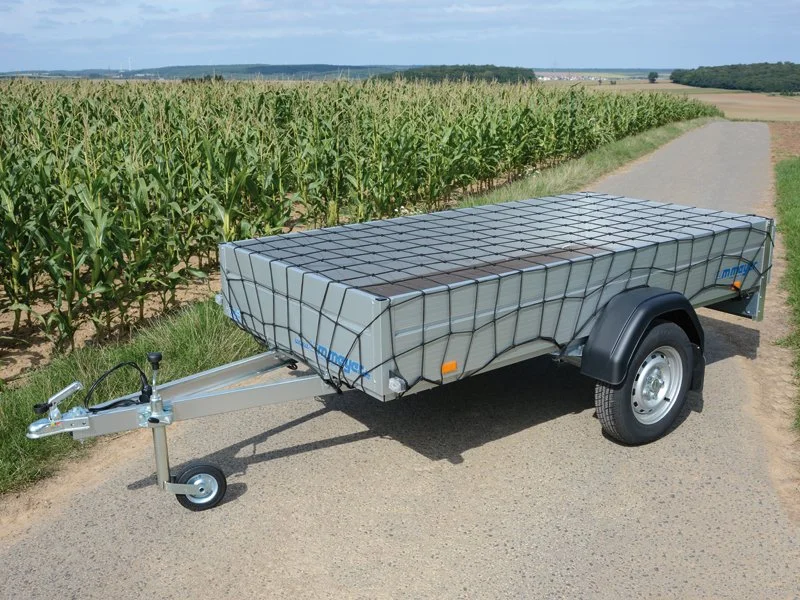 Attelage à boule, essieu et timon en V galvanisés, essieu à suspension en caoutchouc.
