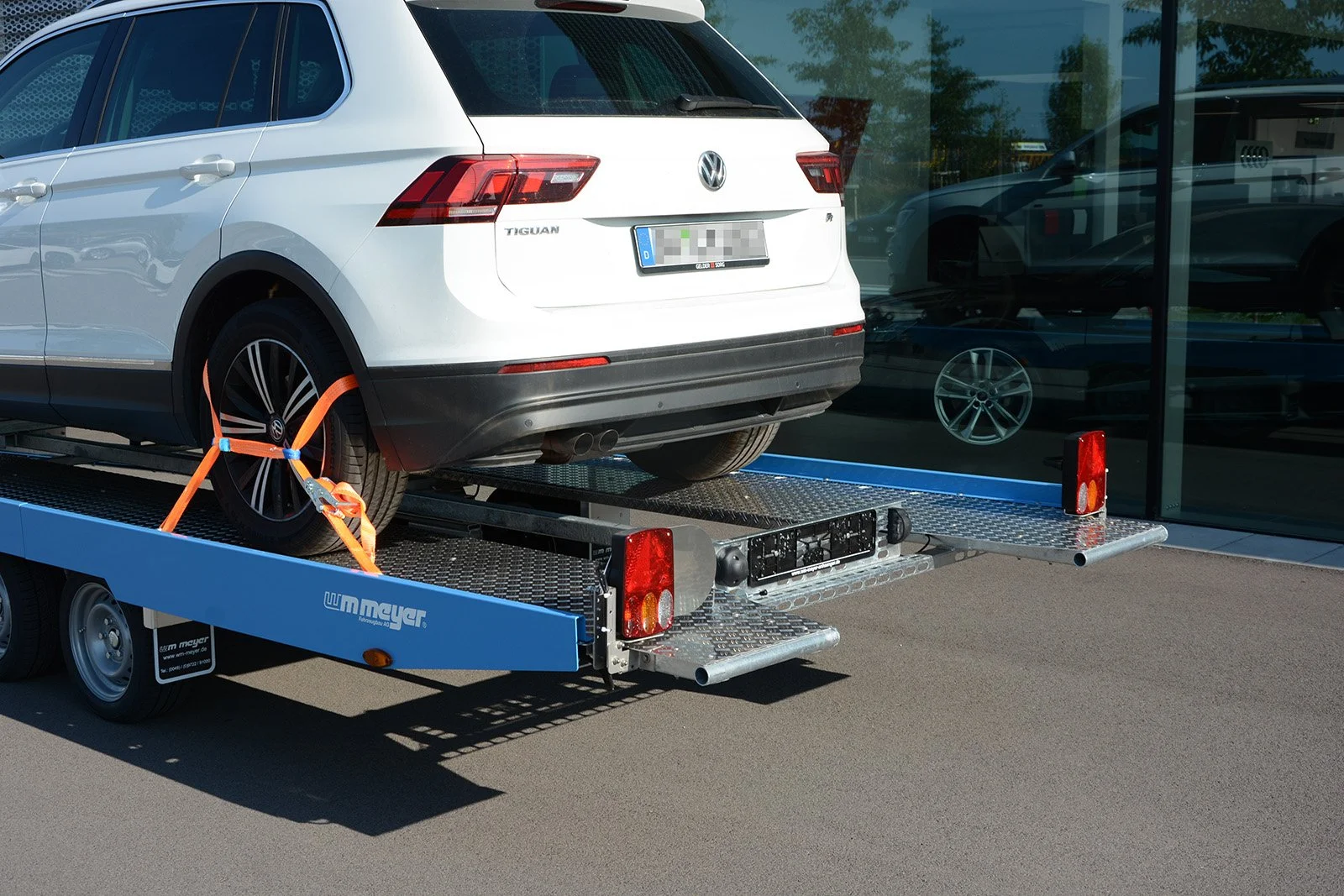 Roue jockey renforcée, support de plaque minéralogique rabattable, plateforme ouverte en aluminium avec 16 trous d'arrimage pour sangles à cliquer, inclinaison : 10°-12+ (selon les pneus).