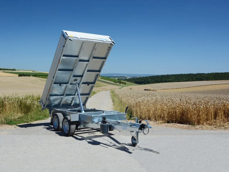 Ridelles en alu anodisé avec rainure pour attacher une bâche (épaisseur : 25 mm, largeur : 330 mm), les ridelles sont ouvrable et amovibles des 4 côtés, ridelle arrière oscillante dans les 2 sens, 4 ranchers